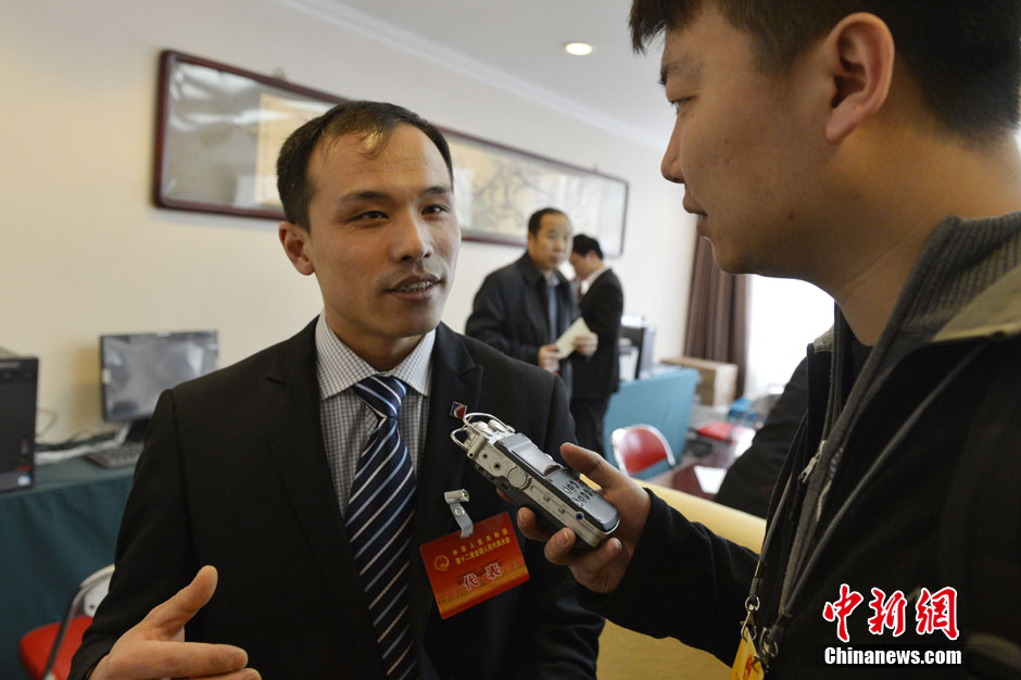 3月2日,参加十二届全国人大一次会议的山西代表团抵达北京。来自山西的全国人大代表、“农民工”董林接受记者采访。中新社发 韦亮 摄