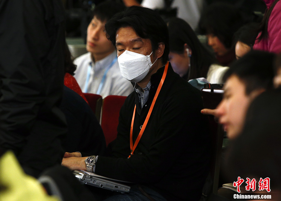 3月2日,全国政协十二届一次会议新闻发布会在北京人民大会堂举行。图为一名记者戴着口罩参会。中新社发 张浩 摄