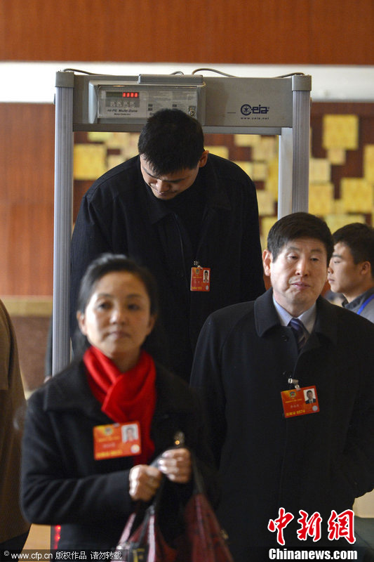 3月2日,北京,姚明现身两会驻地低头过安检。图片来源:CFP视觉中国
