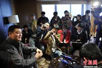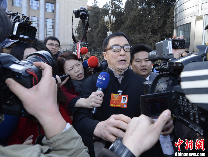 3月3日,全国政协十二届一次会议在北京举行,全国政协委员成龙会议结束后被众多记者团团围住,难以脱身,连称“求求你们”。中新社发 侯宇 摄