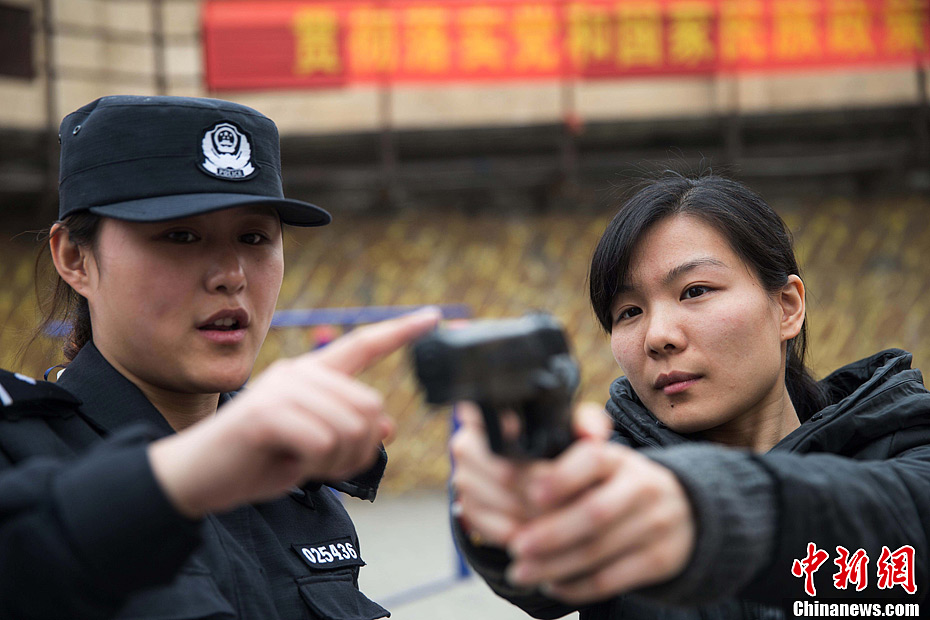 3月6日,安徽省淮北市公安局特警支队与“80后”女职工互动。当日,安徽省淮北市公安局特警支队与淮北铁道社区、“燕飞志愿者服务队”女职工互动演示防身技能,讲解应急防身技巧和方法,帮助女职工提高自我保护和防范能力,互动体验特警生活。中新社发 韩苏原 摄
