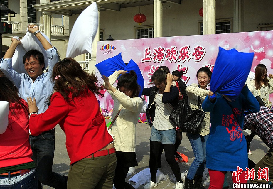 3月8日妇女节,上海欢乐谷特设减压枕头大战,吸引许多年轻男女共同“疯玩”。他们希望能在其间抛开压力,释放情感,展现活力。中新社发 潘索菲 摄