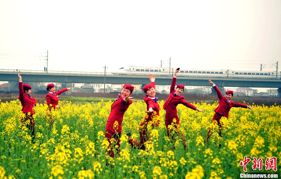 又到春花烂漫时。在江西南昌市郊区,油菜花竞相怒放,绵延数里,好似金色的海洋,吸引着众多游客前往踏青。3月9日,南昌客运段“鄱湖明珠号”动车组的“动姐”们,利用休息时间走近大自然,感受江南美景,陶醉在花丛中。 张岩 摄