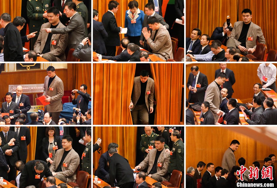 全国政协十二届一次会议召开期间,“小巨人”姚明所到之处,皆成焦点。(拼图)中新社发 刘关关 摄