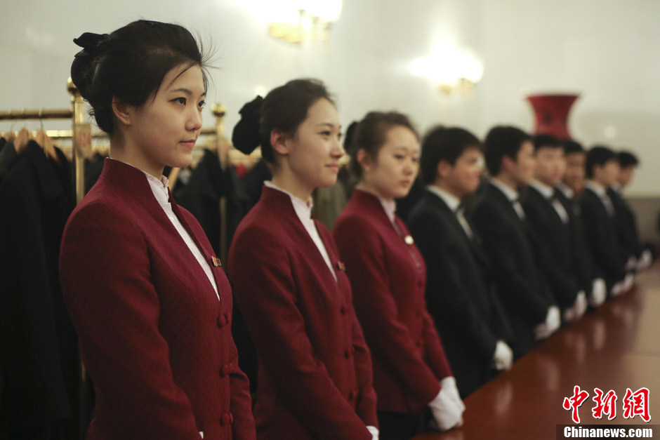 3月12日上午,全国政协十二届一次会议在北京人民大会堂闭幕。人民大会堂内衣帽寄存处的服务人员排成一线,为委员服务。中新社发 赵隽 摄