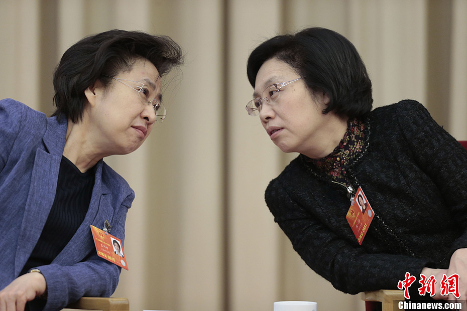 3月6日,上海代表团审议政府工作报告。全国人大代表王乃坤(右)与上海市委副书记殷一璀在会上交流。中新社发 杜洋 摄