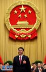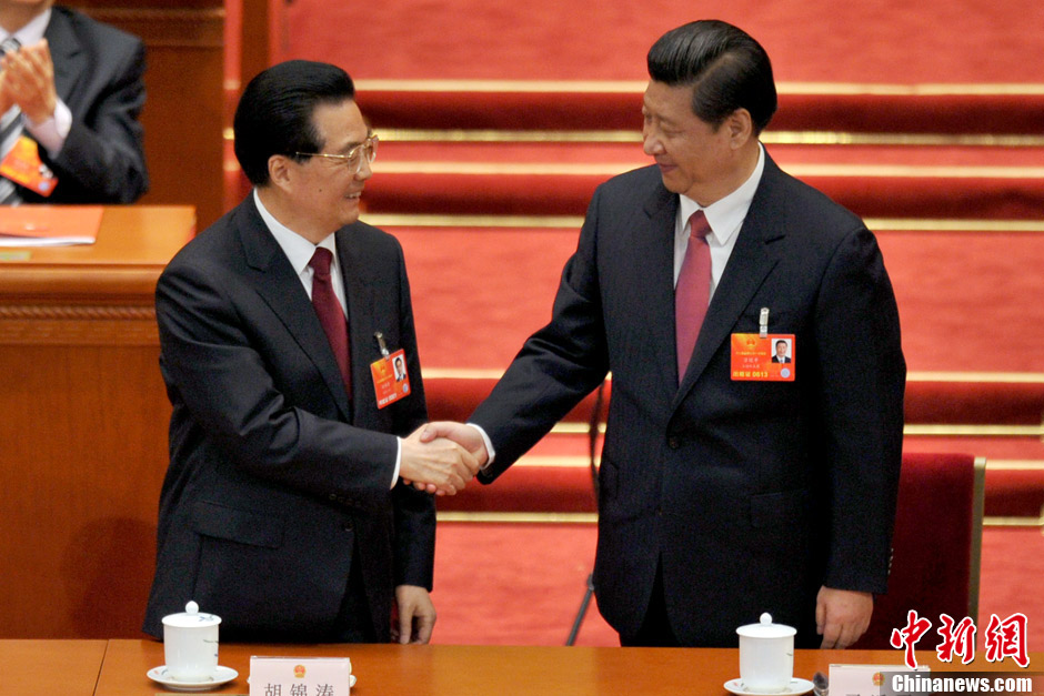 3月14日,习近平当选为中华人民共和国主席。胡锦涛与习近平握手。中新网记者 金硕 摄