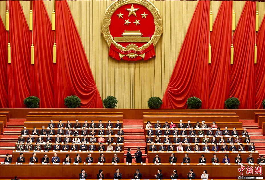 3月14日,十二届全国人大一次会议在北京人民大会堂举行第四次全体会议。习近平当选中华人民共和国主席和中华人民共和国中央军事委员会主席。图为胡锦涛与习近平握手。中新社发 杜洋 摄