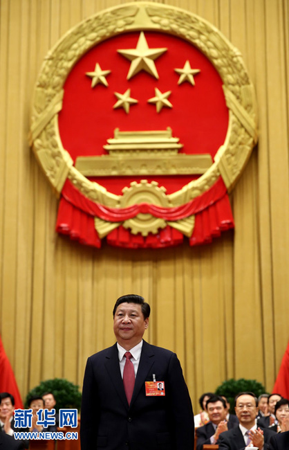 3月14日,十二届全国人大一次会议在北京人民大会堂举行第四次全体会议。习近平当选中华人民共和国主席和中华人民共和国中央军事委员会主席。这是习近平当选后向全场代表致意。新华社记者 兰红光 摄 图片来源:新华网