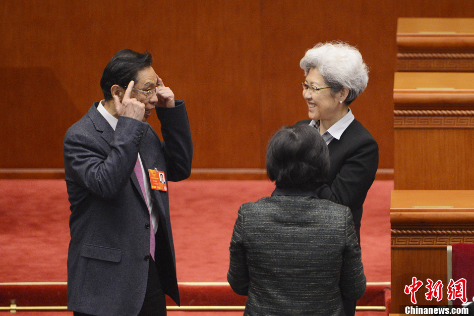 3月15日上午,十二届全国人大一次会议在北京人民大会堂举行第五次全体会议。图为会议休息时,钟南山与傅莹交流。中新社发 廖攀 摄