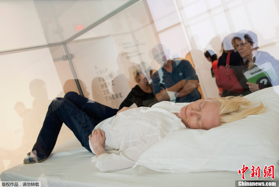 当地时间2013年4月17日,美国纽约,女星蒂尔达·斯文顿在现代艺术博物馆内进行名为《也许》的行为艺术,以睡姿躺在玻璃箱内。
