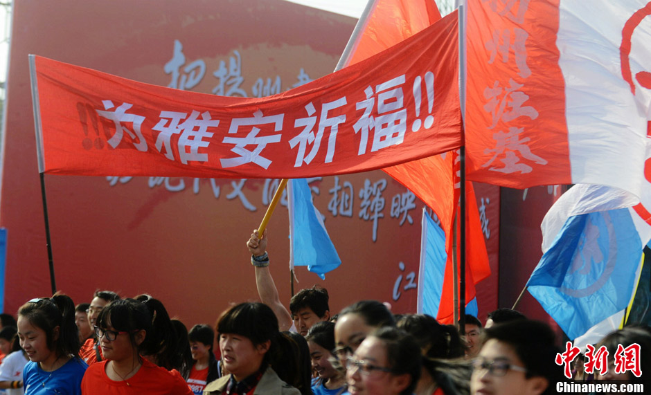 扬州马拉松参赛人员打出“为雅安祈福”横幅