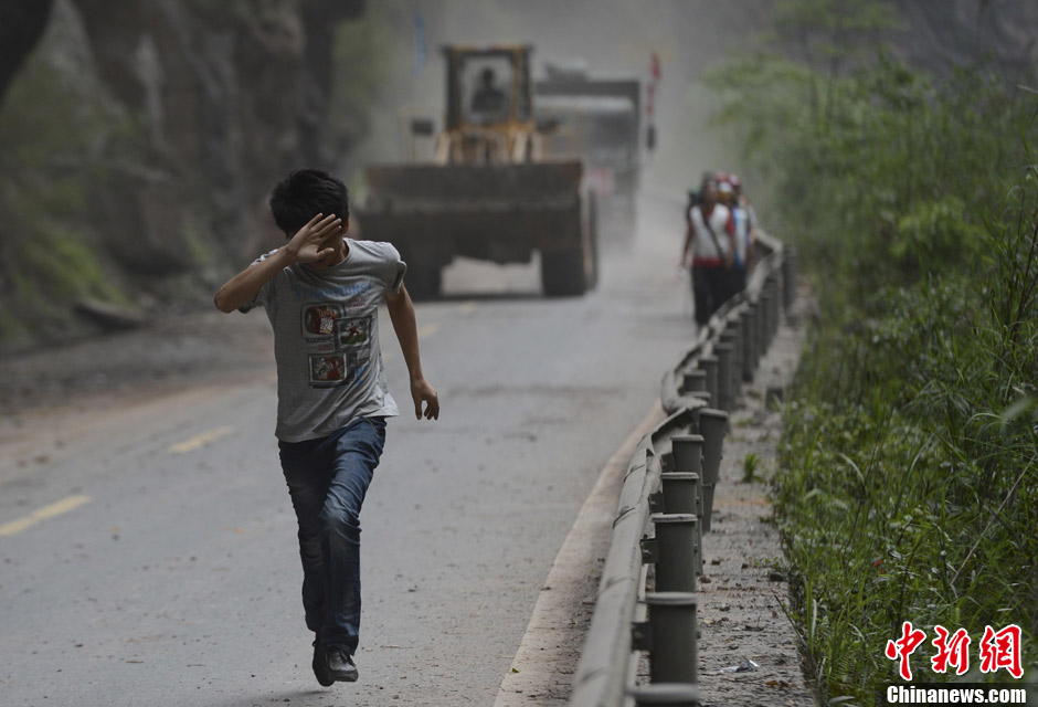 4月21日,通往重灾区宝兴的公路尚未恢复。芦山县通往宝兴县s210省道紧张抢修,与宝兴交通联络水陆空全方位推进。中新社发 廖攀 摄