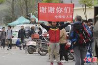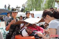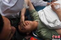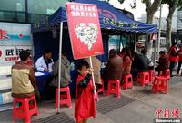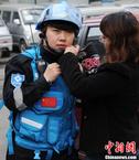 4月21日,在武汉街头一献血屋旁,7岁小男孩方逍越身着志愿者背心号召市民“捐一份热血,为雅安祈福”格外引人瞩目。中新社发 张畅 摄