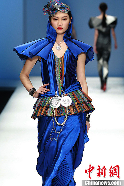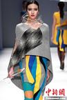 4月26日晚,正在北京举行的2013中国大学生时装周推出北京联合大学师范学院毕业生作品发布会,该院艺术设计系服装与服饰设计专业挑选了23位同学的70套服装作品入围参加此次毕业作品发布,作品以“趣味”为主题通过混搭的材质运用,大胆的廓型设计,色彩的灵活搭配以及创新的设计理念,款款风格独具。图为模特展示北京联合大学师范学院毕业生作品发布会作品。中新社发 钱兴强 摄