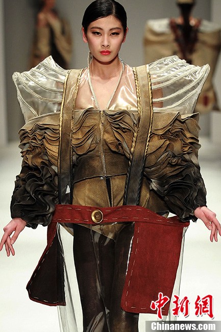 4月26日晚,正在北京举行的2013中国大学生时装周推出北京联合大学师范学院毕业生作品发布会,该院艺术设计系服装与服饰设计专业挑选了23位同学的70套服装作品入围参加此次毕业作品发布,作品以“趣味”为主题通过混搭的材质运用,大胆的廓型设计,色彩的灵活搭配以及创新的设计理念,款款风格独具。图为模特展示北京联合大学师范学院毕业生作品发布会作品。中新社发 钱兴强 摄