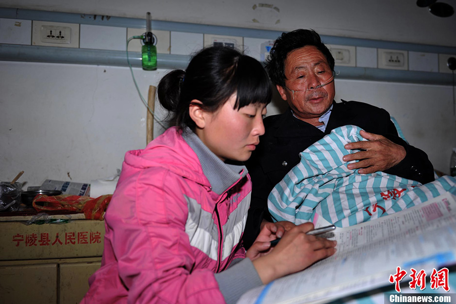 在医院的病床前,小香浦守着躺在床上的爸爸开始复习自己的功课。晚饭时间,小香浦给父亲带来一些父亲喜欢吃的饭菜,虽然很简单,但是很幸福。赵秋实 摄
