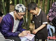 4月28日,记者走进位于震中四川芦山县龙门乡王家村石刀背沟组的“竹林小学”,探访50多名学生的震后学习生活。“竹林小学”是由来自湖南怀化的志愿者为当地贫困学生搭建的。50多名学生都是王家村及附近村庄的贫困学生,大的17岁,小的只有3岁。“竹林小学”至今已开学整整七天。图为“竹林小学”上课现场。安源 摄