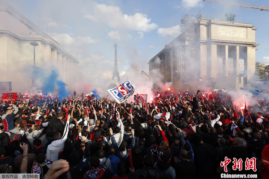 5月13日,在巴黎埃菲尔铁塔前人权广场举行的法甲冠军颁奖仪式上发生球迷骚乱。
