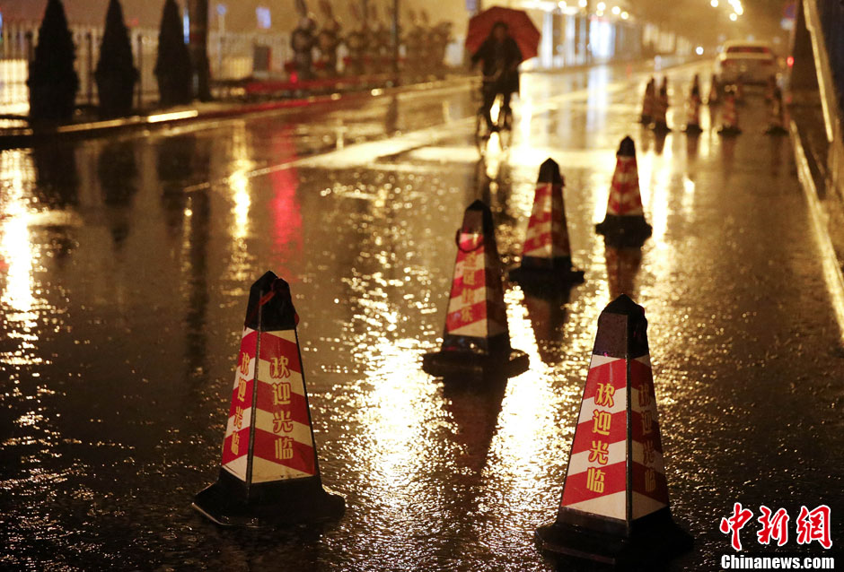 6月4日深夜,一位北京市民冒雨前行。当日20时20分,北京市气象台继续发布雷电黄色预警信号,并于20时45分发布暴雨蓝色预警信号。中新社发 刘关关 摄