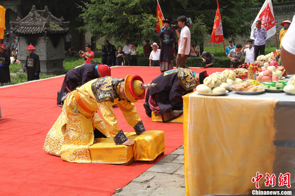 7月7日,满族爱新觉罗氏皇家后裔以及来自全国各地60余名满族后裔会聚清永陵,进行癸巳年祭祖祈福活动。此次祭祖活动是2013满族人回家·新宾启运节的子活动之一。图为乾隆皇帝七世孙爱新觉罗·恒绍带领清皇室后代祭拜先祖。中新社发 曹立春 摄