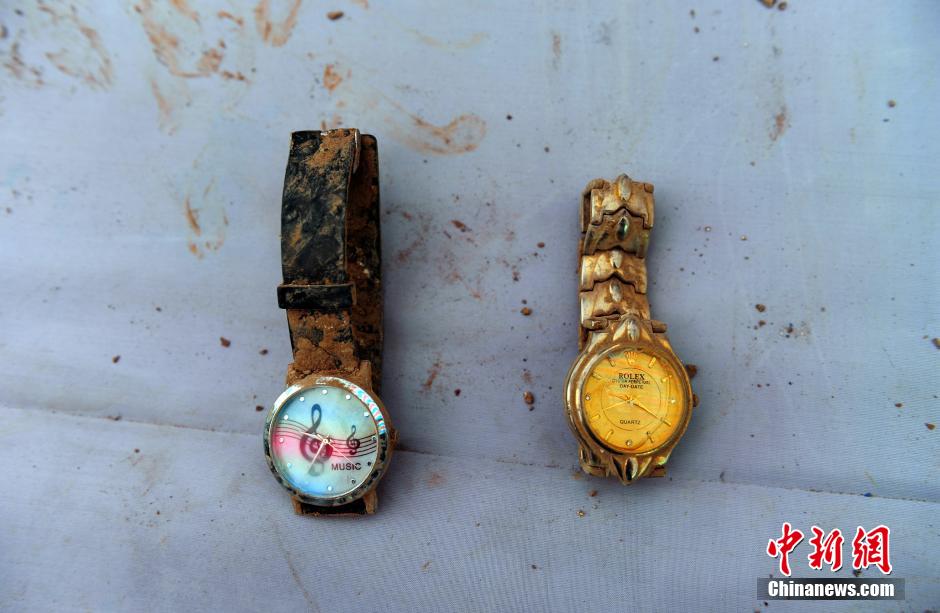 6月11日,湖北监利殡仪馆,“东方之星”客轮上清理出来的323件物品已完成身份核对。工作人员已经将搜集到的遇难者遗物集中编号、登记,供遇难者家属前来认领。图为遇难乘客的手表。中新社发 张畅 摄