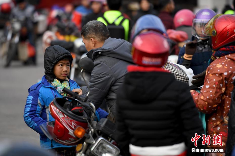 2月8日,广西梧州市东出口春运服务站,一名跟随父母骑摩托车返乡的孩童。梧州市交警支队介绍,自春运以来,过境梧州东出口的返乡摩托车数量已超25000辆。中新社记者 俞靖 摄
