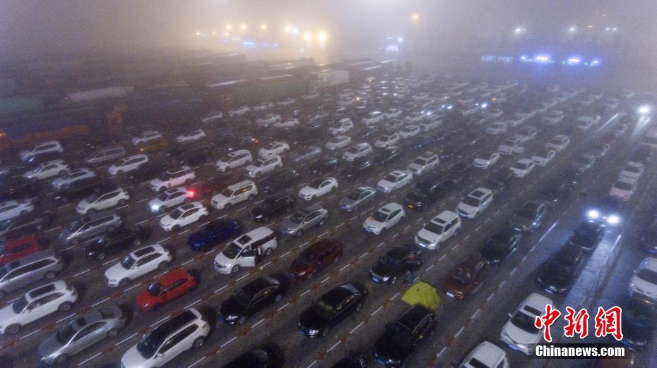 2月25日凌晨,海口市区再次出现浓雾天气,海口市气象台发布大雾橙色预警。受大雾天气影响,能见度低,琼州海峡再次全线停航,暂停船舶进出港。深夜下的海口秀英港、新海港、南港港区内外依然有8000余辆滞留车辆排队等待过海。图为航拍海口秀英港码头内排队等待过海的车辆。中新社记者 骆云飞 摄