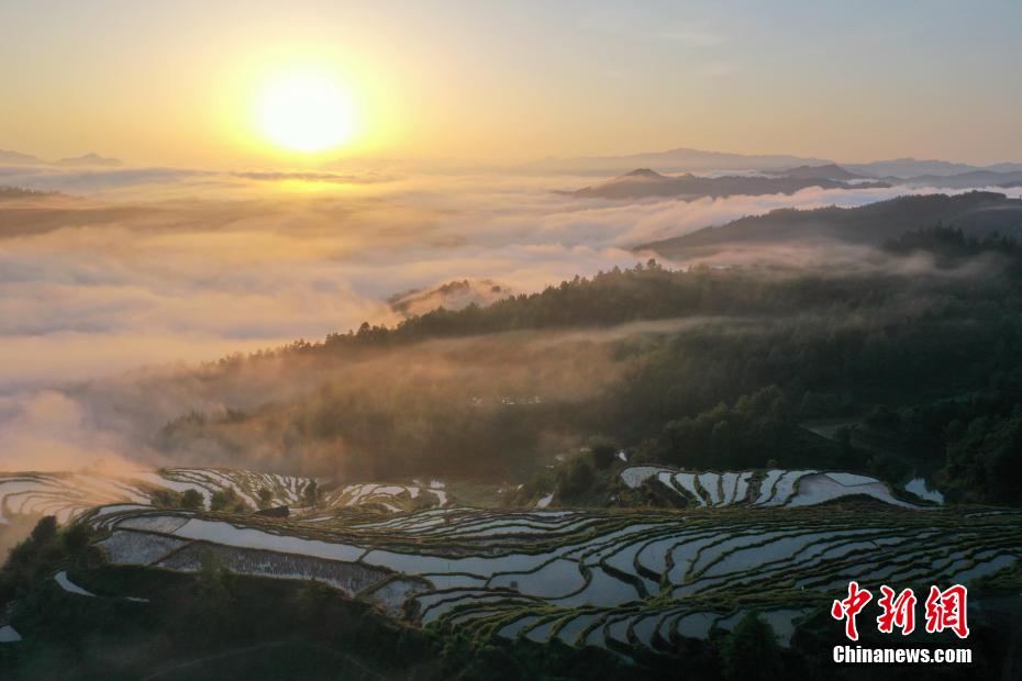 春耕时节,地处贵州省从江县的月亮山百里梯田逐渐进入最美观景季节。灌满水的梯田,犹如一条条银带缠绕在山间,层层叠叠,在阳光照射下,色彩斑斓,田水与天色相互辉映,勤劳的农民与古色古香的民族村寨,共同绘就出一幅幅绝美的田园风光画卷。图为从江县丙妹镇岜沙村拍摄的梯田景色。 吴德军 摄