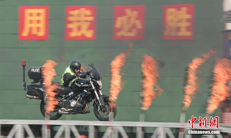 9月11日,北京市公安局在反恐怖和特警总队举办第二批队伍教育整顿主题开放日活动,进行特警车辆、装备、单警技能、警犬技术、摩托车驾驶技术成果展示。北京市人大代表、政协委员和市民代表等300余人走进警营参观体验。图为特警队员进行摩托车特技驾驶展示。 中新社记者 贾天勇 摄