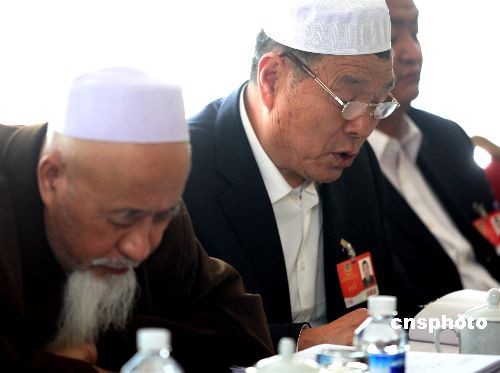 在北京参加“两会”的民族界全国政协委员马文丕,3月5日下午在分组讨论会上建议国家在少数民族地区实行高中义务教育。中新社发 宋吉河 摄